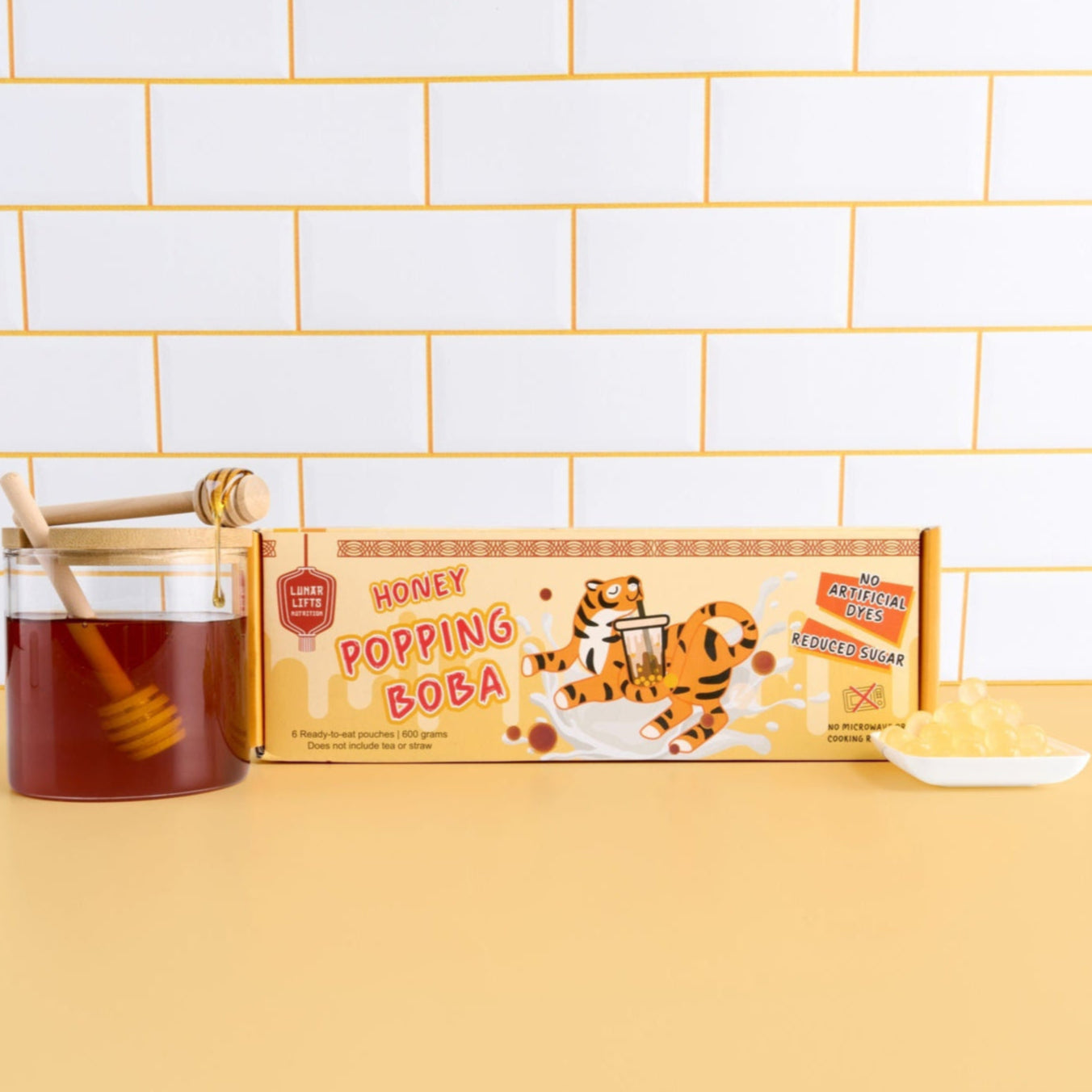 A better-for-you spin on a boba shop favorite, our Honey Popping Boba adds a burst of golden sweetness to any drink - no prep needed. With reduced sugar and calories, each pearl has a juicy pop and is made from seaweed extract for a plant-based twist. Perfect for topping off your favorite Lunar Lifts protein boba tea for a fun, guilt-free treat.